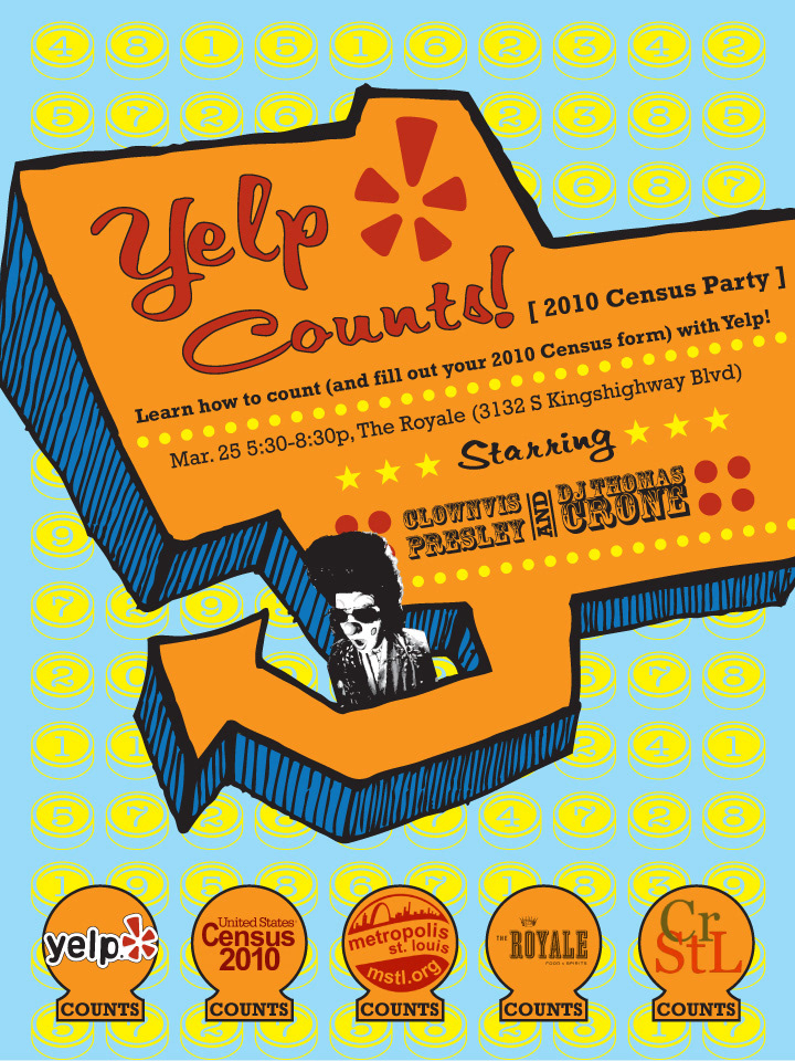 Poster inviting St. Louis locals to attend event to fill out their 2010 Census forms. Used in print and online at www.yelp.com on event page and in local e-mails.
